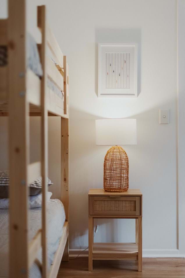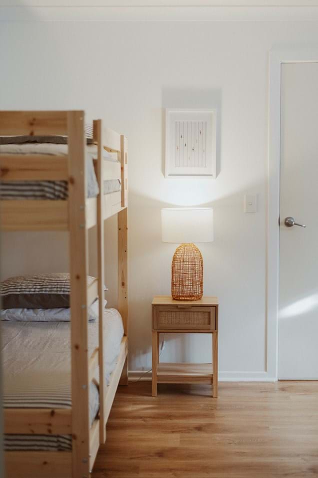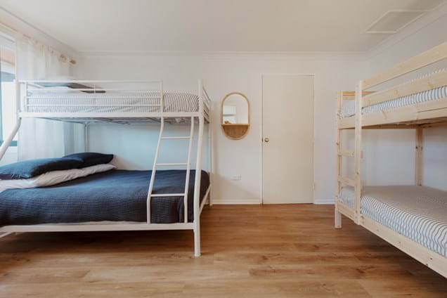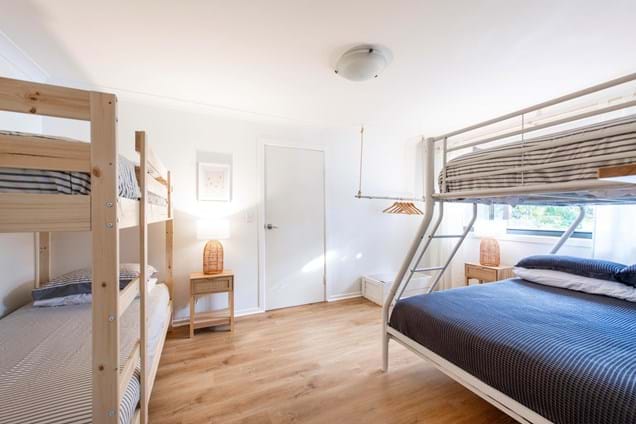 1 Queen bedroom, 2nd Bedroom sleeps 5 in Double bunk bed, and 2 single bunks.